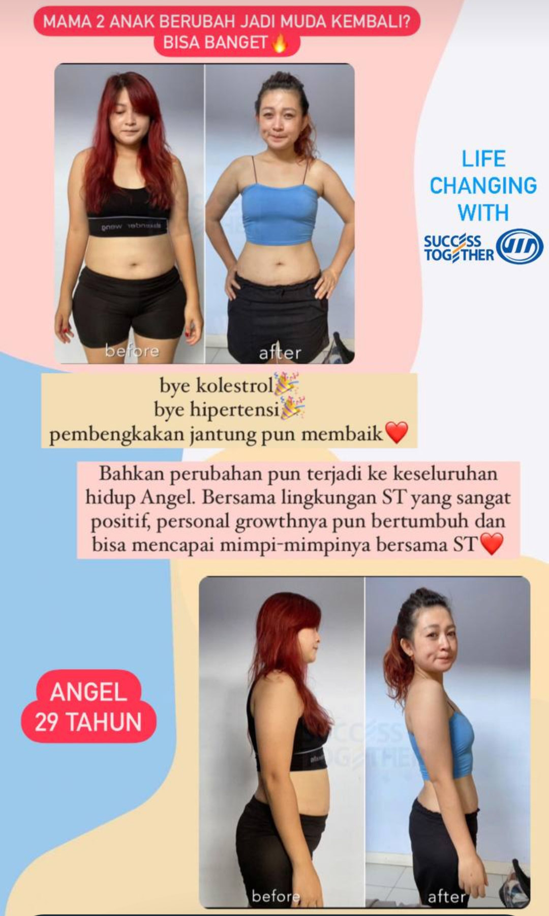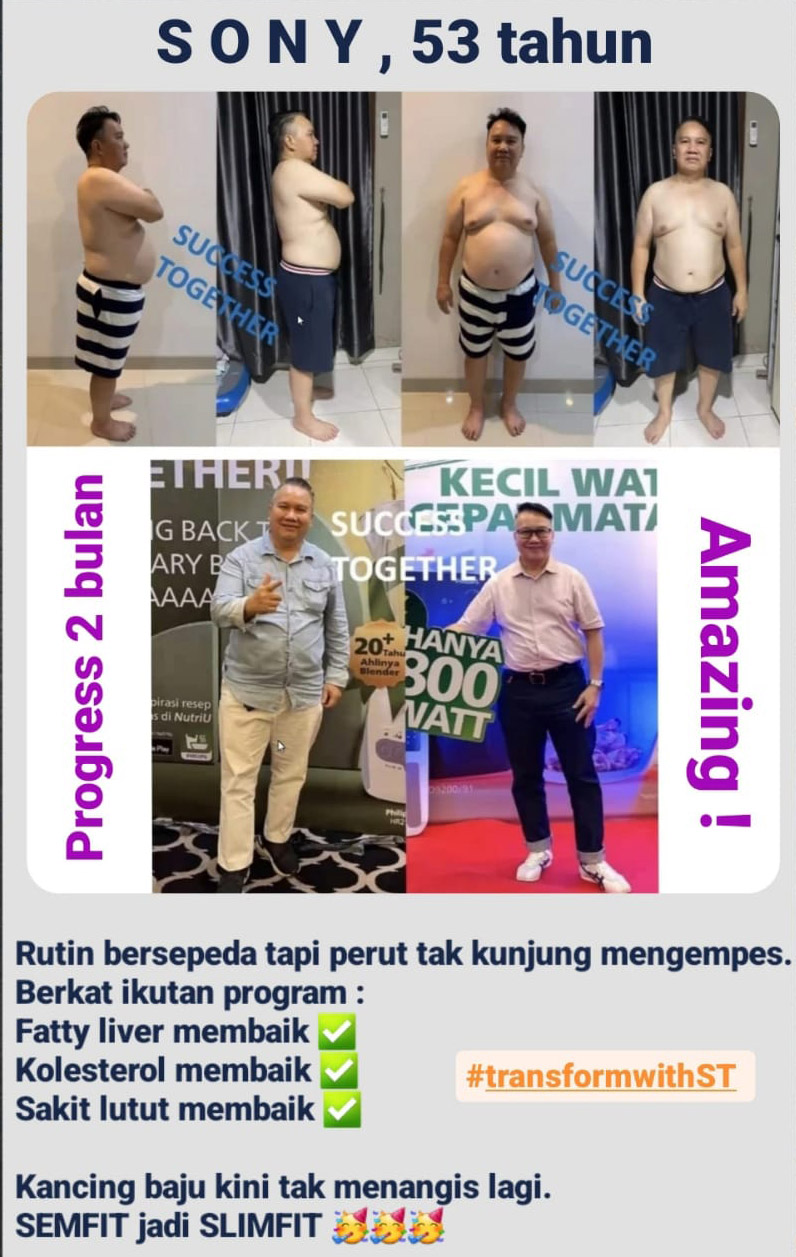 Benefit yang kami tawarkan bukanlah pengetahuan yang disalin dari brosur, melainkan adalah pengalaman pribadi kami sendiri. Kami memiliki kepercayaan diri ketika mengatakan diet #transformWithST akan berhasil dan tidak bounce back, karena kami sudah menjalani dan mengalami sendiri secara nyata. Suami saya sendiri adalah bukti nyata bebas dari hipertensi akibat obesitas.